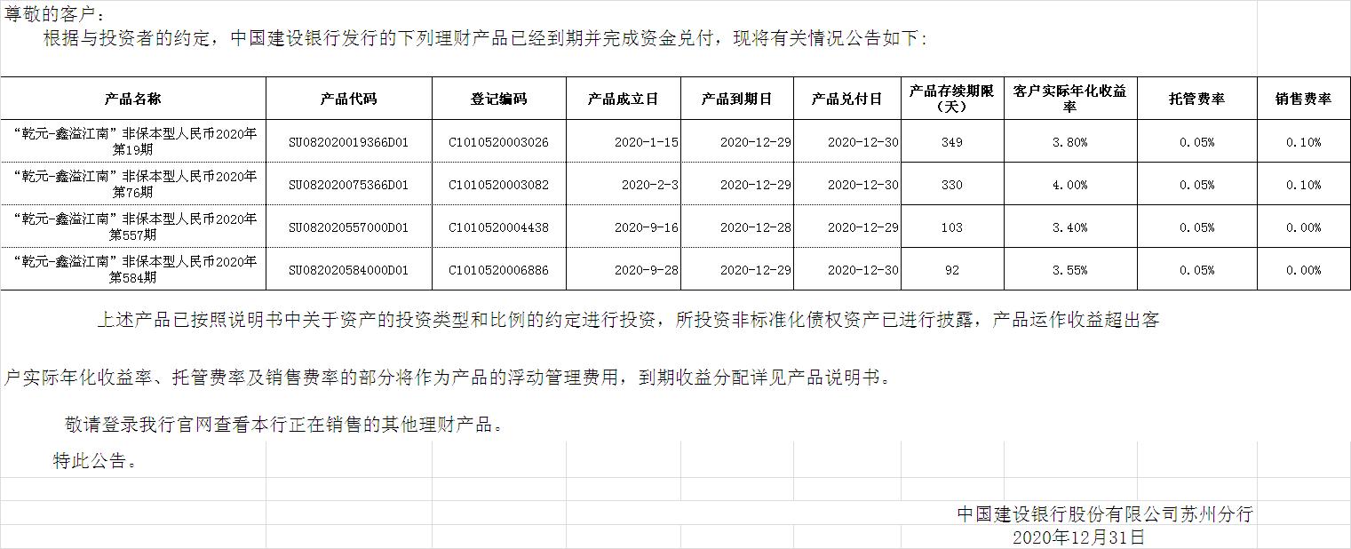 中国建设银行理财产品终止及清算公告